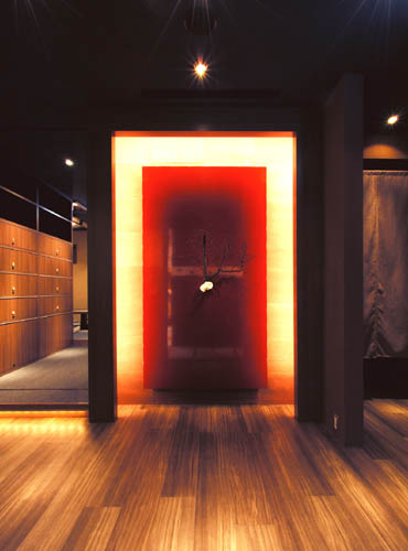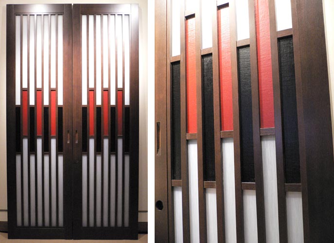 赤と黒の漆パネル(技法:布目)を格子に組み込みました。