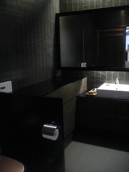 ユニットバスの洗面カウンターとミラー枠に漆を塗りました。